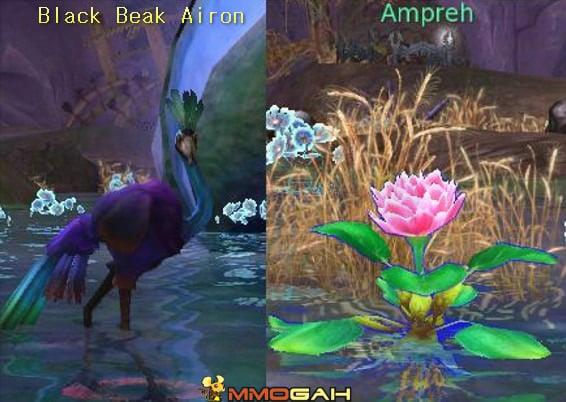 At the eastern extremity of the lake shoreline, locate NPC Bolir who offers an additional questline. Accept his assignment before venturing into the lake proper. Within the aquatic environment, harvest six Ampreh Flowers from distinctive plants while simultaneously hunting black-beaked Airon birds for their breast feathers.