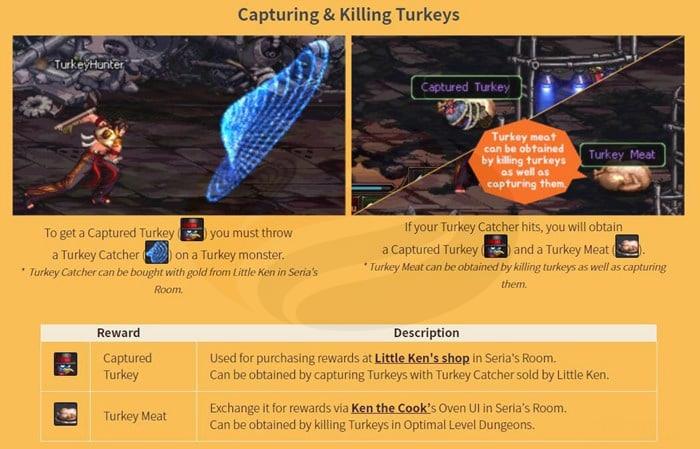 Reward delivery: Successfully returning captured turkeys to Little Ken or delivering turkey meat to Ken the Cook in Seria’s Room yields various rewards.