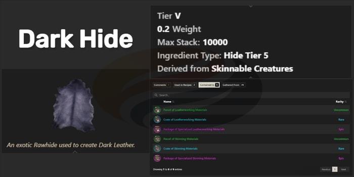 4TL;DR Dark Hide requires Skinning 20+ and drops from level 63+ creatures in Elysian Wilds and Brimstone Sands Mammoths at Dredge Landing offer highest yield, while lions provide co...