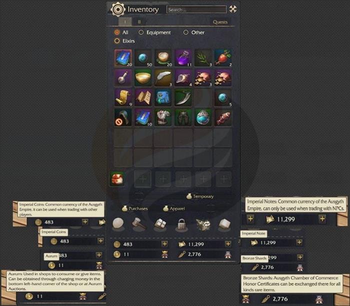 - Identify currency types in your inventory: Imperial Coins, Imperial Notes, Aurum, Bronze Shards